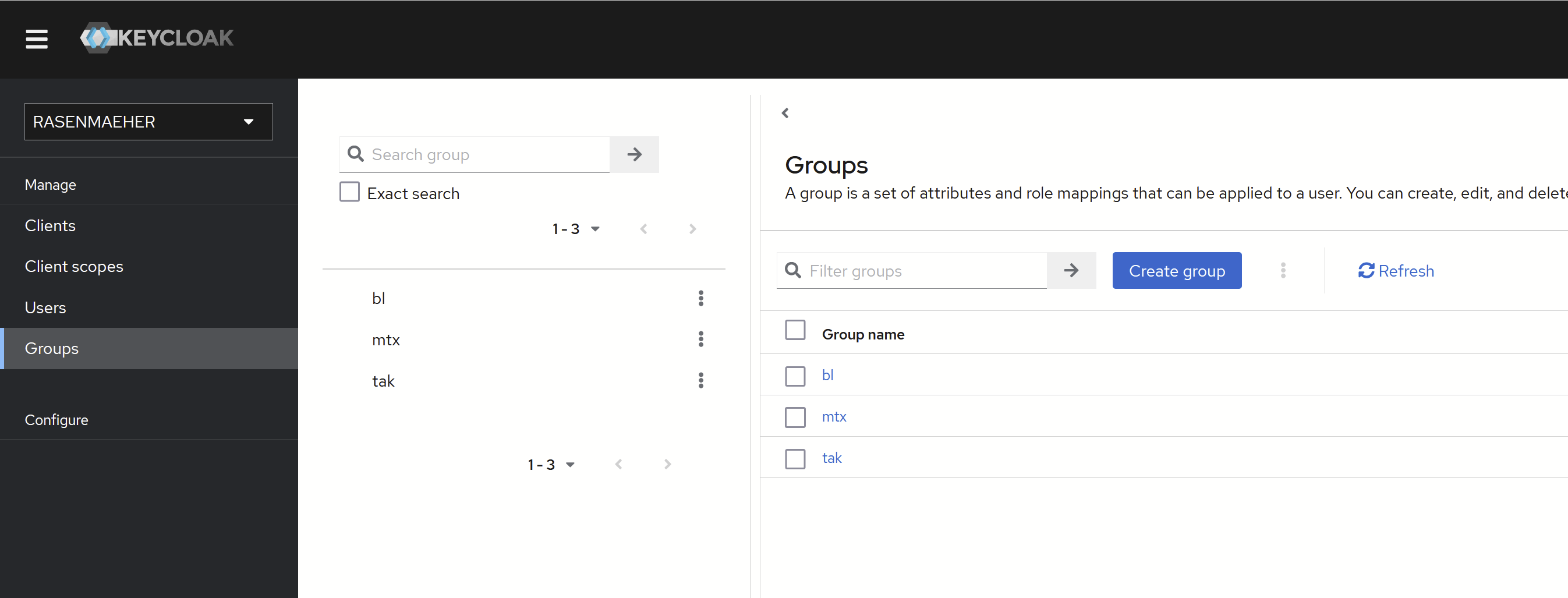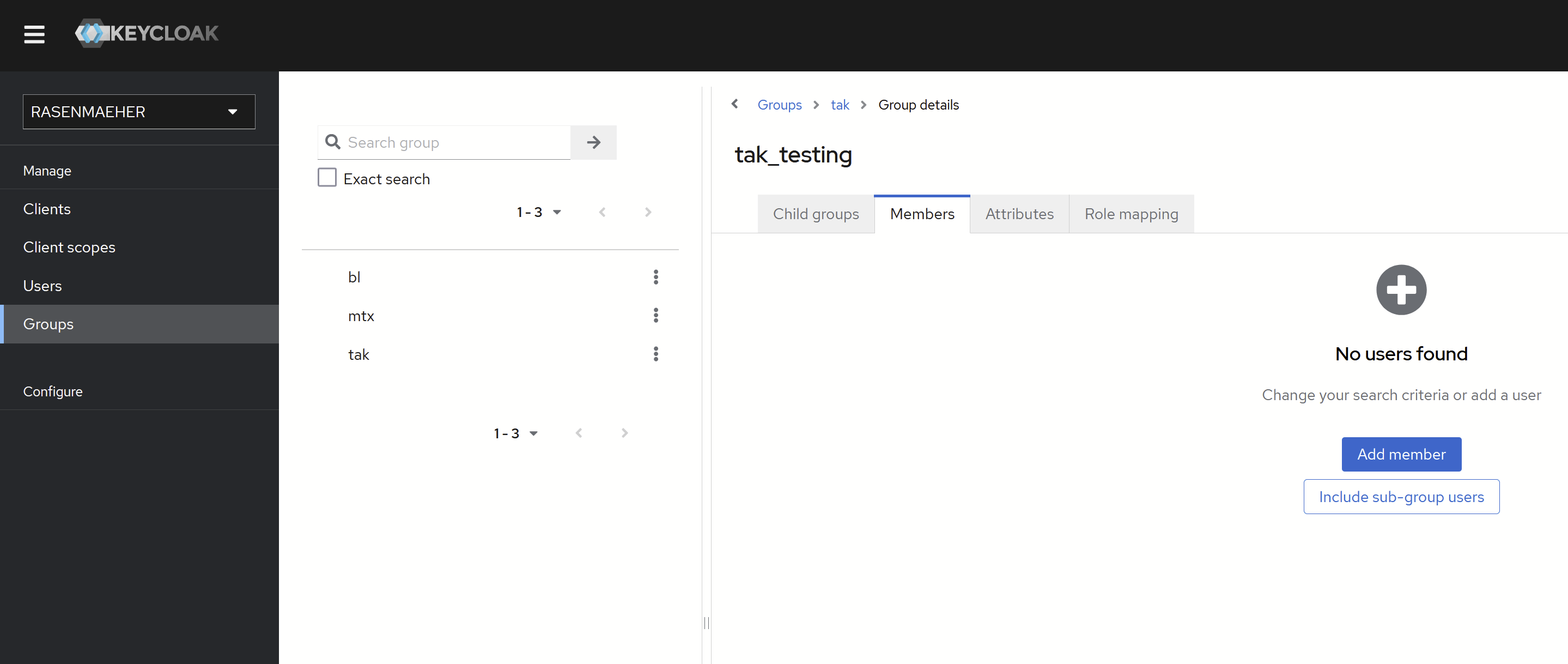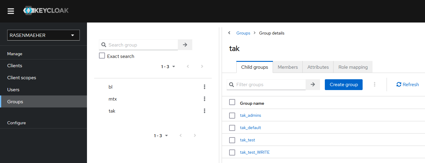Current Rasenmaeher environment uses Keycloak to manage user groups. These groups are relayed to takserver and connected users get them automatically.