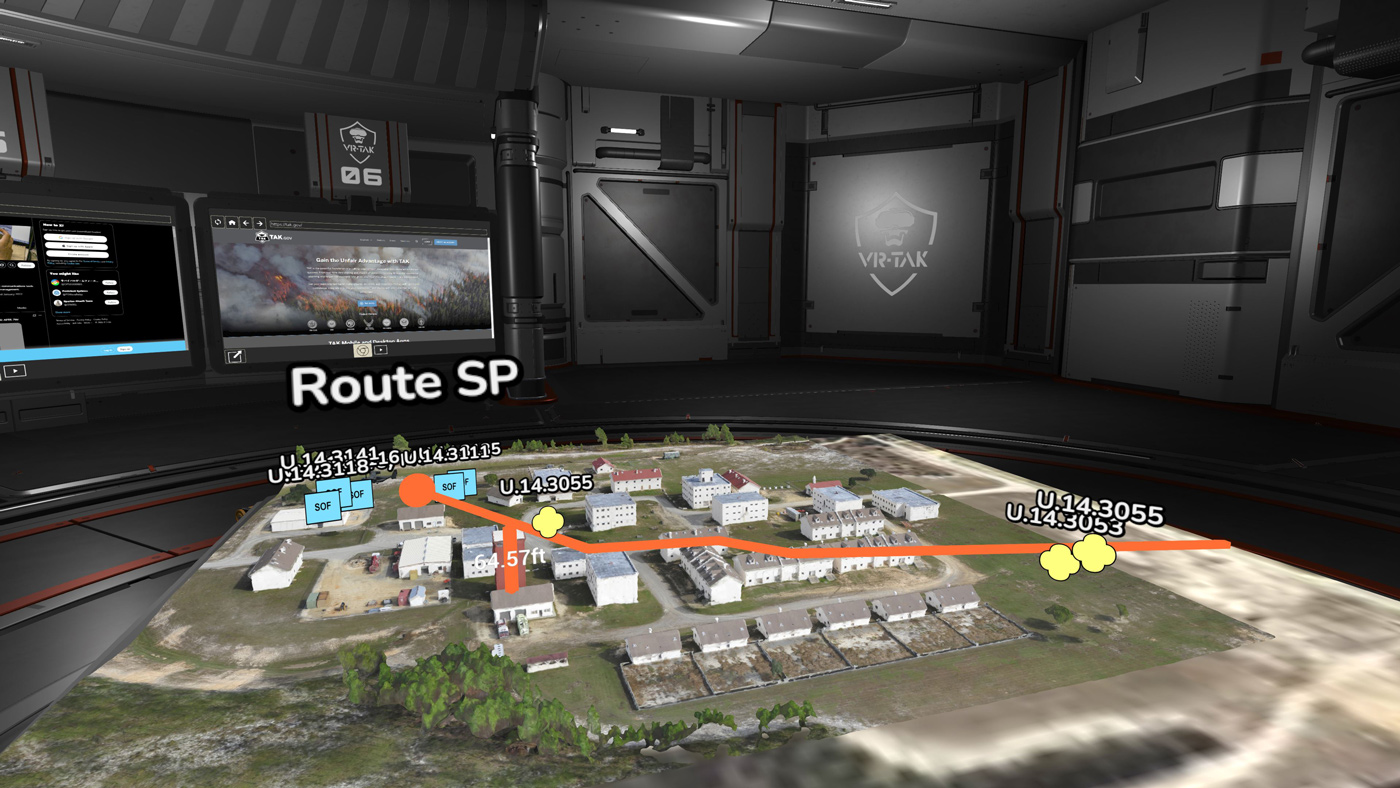The VR-TAK development effort leverages virtual reality to create a virtual world capable of interacting with and manipulating data in the TAK ecosystem for mission planning and heads up augmented reality operation. The 3-D content, created by FMVto3D, can be viewed using: commercial virtual reality (VR) hardware, through a desktop using video game controllers/keyboard and mouse, or handheld on TAK devices. VR-TAK and FMVto3D software is government owned and operated, just like TAK. All necessary hardware/software is commercially available for less than $13k/kit, fits into a man-portable pelican case, and can be operated in austere environments.